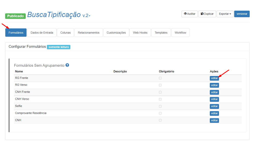 Para tal, é necessário ir até a aba Formulários do Workflow, clicar na opção "Editar" do formulário desejado e marcar a opção "Manter tipificação até o fim do processo".
