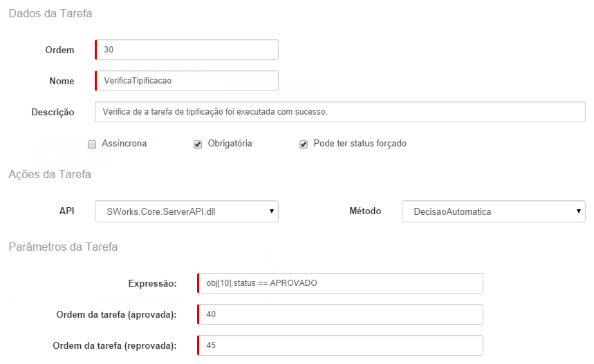 Vamos incluir agora uma tarefa de decisão, onde será verificado se a tarefa 10 foi executada com sucesso. Para esta tarefa, será selecionado também a API principal (Core) do S-Works e o método “DecisaoAutomatica”. Para este método, vamos ter três campos. O primeiro é a expressão utilizada para validar (no caso estamos colocando obj[10].status == APROVADO). O OBJ identifica que é um objeto do fluxo e entre colchetes o número 10 indica que o objeto é a tarefa de ordem igual a 10. Já o “.status”, é uma propriedade deste objeto, que estamos verificando se a tarefa 10 foi aprovada. Se esta expressão for verdadeira, o fluxo vai seguir para tarefa definida em “Ordem da tarefa (aprovada)”, se não, o fluxo segue para tarefa “Ordem da tarefa (reprovada)”.
