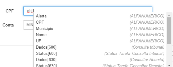 Ao digitar na expressão obj. será mostrada uma caixa de seleção com os campos de entrada e retornos de tarefas, conforme tela de exemplo abaixo.