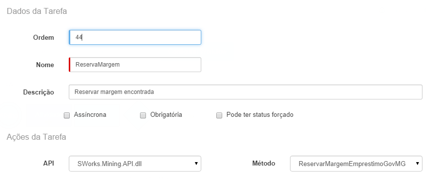 A tarefa de ordem 44 será configurada para efetuar a reserva de margem. Segue abaixo os dados da tarefa, ações da tarefa e parâmetros da tarefa.