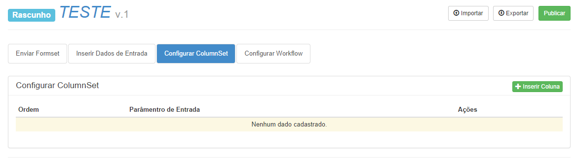 A funcionalidade de configurar ColumnSet é para definir as colunas que vão aparecer na tela de monitorar processos. Para incluir as colunas, basta clicar em “Inserir Coluna”, onde será solicitado informar o número de ordem que a coluna vai aparecer e qual coluna dos parâmetros de entrada.