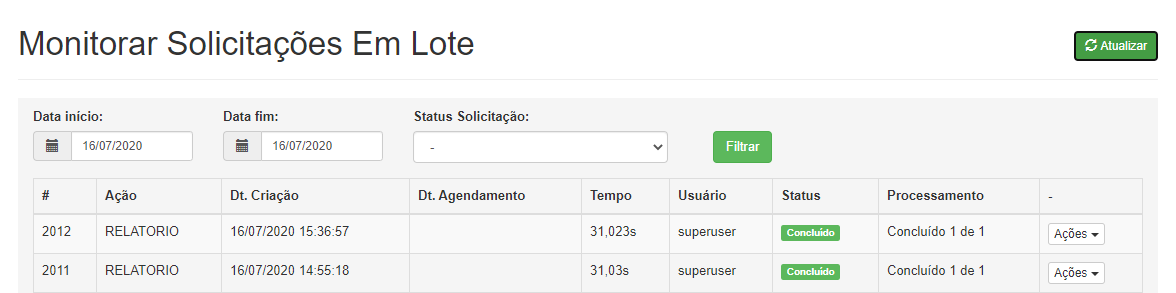 Caso a solicitação esteja com Status ‘Pendente’, clique no botão ‘Atualizar’ no canto superior direito até que o Status fique como ‘Concluído’.