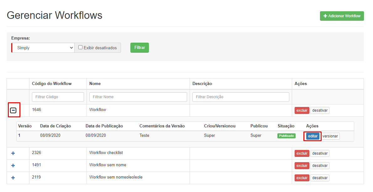 3. Selecione o Workflow desejado e clique em editar.