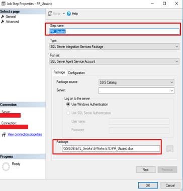 5. Crie 16 steps de acordo com a lista de cargas mencionadas no passo 1 (Neste item serão as cargas de IL). Adicione o nome da stop de acordo com a carga a ser criada, em type selecione SQL Integration Services Package e em Server coloque o IP do servidor de banco de dados de onde os dados serão extraídos.