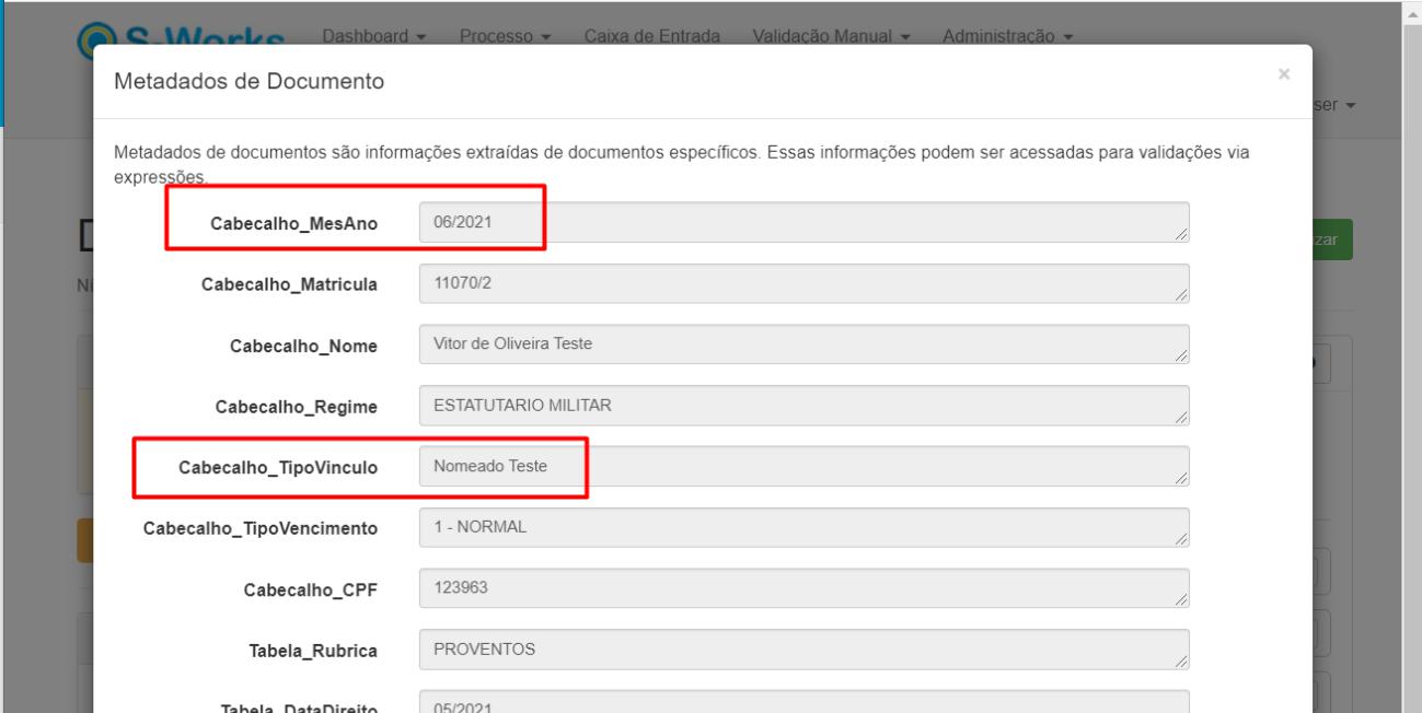 Se visualizarmos os metadados do primeiro documento, verifica-se que ele possui o metadado ‘Cabecalho_TipoVinculo’, com o valor Nomeado Teste. Já o metadado ‘Cabecalho_MesAno’ possui o valor 06/2021.