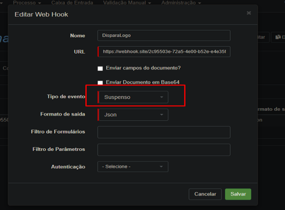 Criamos no webhook mais um tipo de evento chamado “Suspenso”, em conjunto com a tarefa de checklist. Assim, quando ela for suspensa, o comentário informado no motivo de suspensão será enviado para o endereço configurado no webhook junto ao status de pendência.