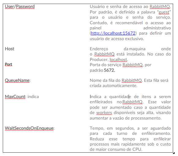 <add ServiceType="RabbitMQProducer" name="Serviço de Producer" assemblyname="SWorks.Orquestrador, Version=1.1.0.0, Culture=neutral, PublicKeyToken=5c21879e795ae678" typename="SWorks.Orquestrador.RabbitMQProducer" User="sworks" Password="sworks" MaxCount="4" Host="localhost" Port="5672" QueueName="Queue01" WaitSecondsOnNoTasks="5" WaitSecondsOnCaptureError="20" WaitSecondsOnEnqueue="10" />