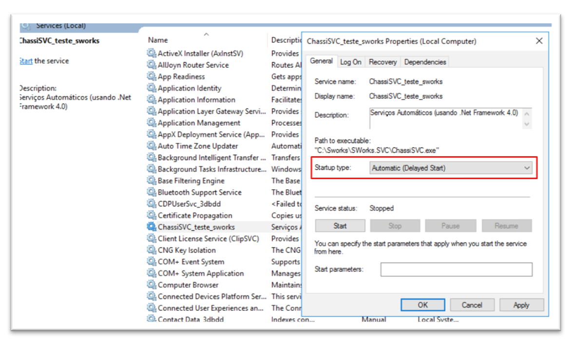 Na primeira aba, em "Startup type" altere para "Automatic (Delayed Start)".
