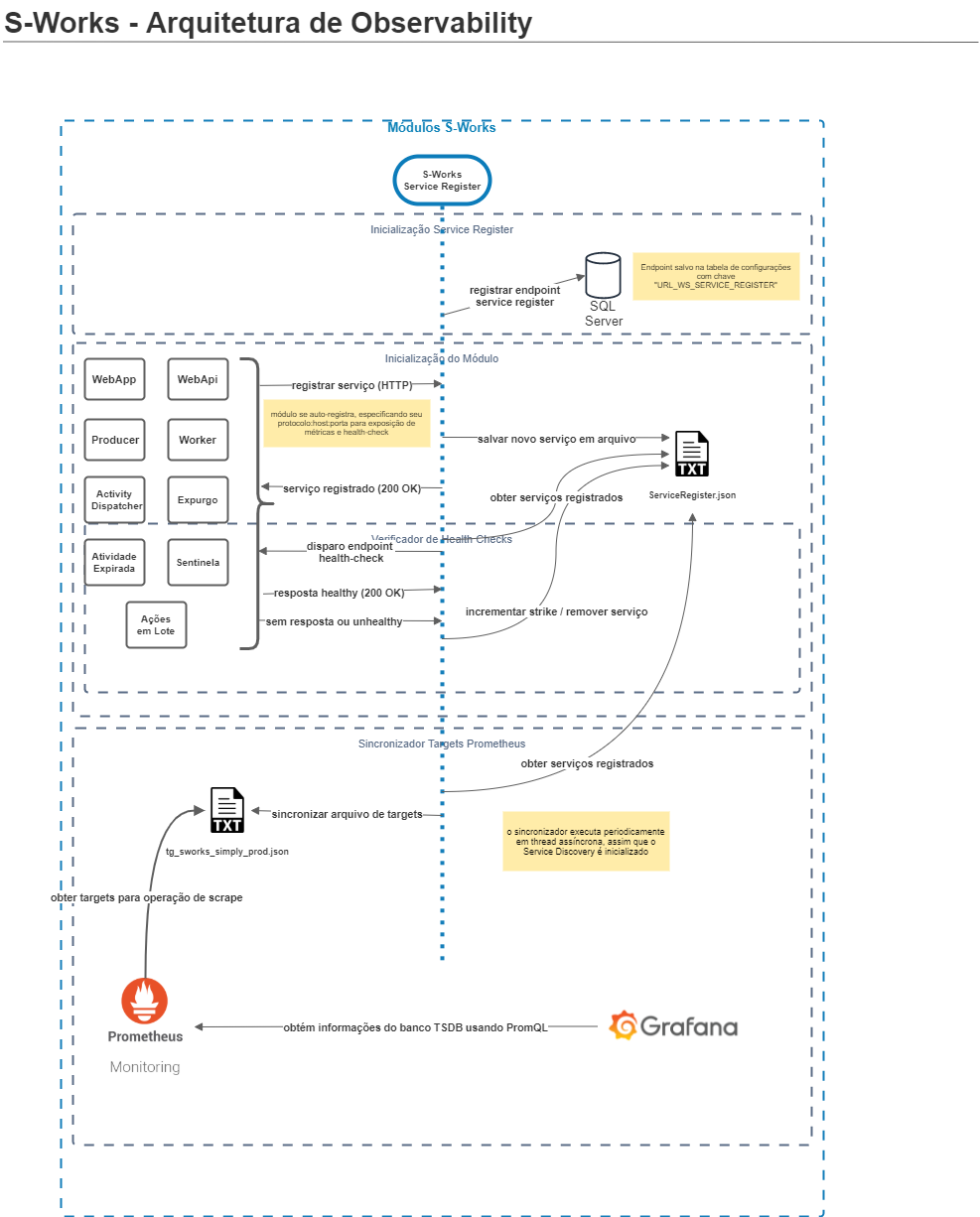 Isso se Devido à dinamicidade de instâncias em execução do S-Works, quando implantado de forma clusterizada e utilizando recursos de auto-scaling, a configuração de endpoints de scrape precisa ser constantemente atualizada pelo Service Discovery. Dessa forma, o Prometheus sempre estará coletando as métricas das instâncias/módulos em execução.