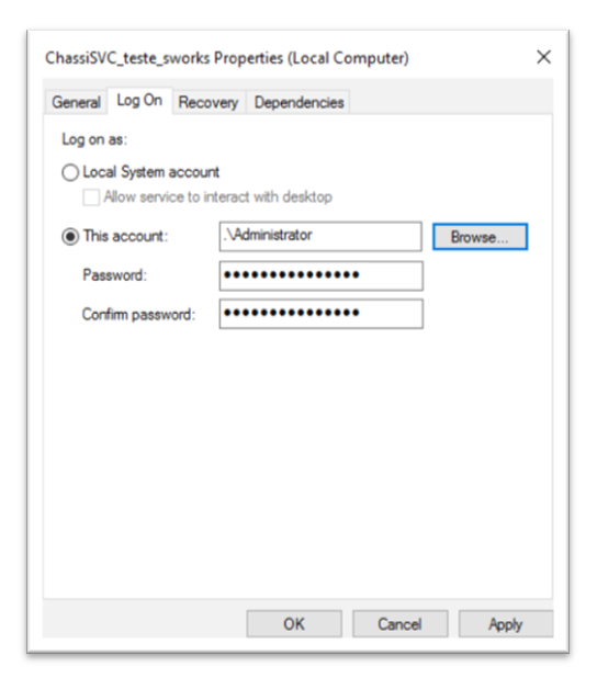 Na segunda aba "Log On", utilize as credenciais de Administrator local ou Administrator do Domain.