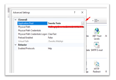 Clique com o botão direito sobre a aplicação “SWorks.WebApi”, depois em “Manage Application” e “Advanced Settings”.