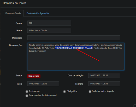 Diante disso em resumo o processo de comparação pega o tamanho do nome informado no dado de entrada, baseado nesse valor ele usa o como posição para extração de conteúdo na OCR e comparando o texto informado no dado de entrada com o texto que foi encontrado na OCR. Desta forma ele verifica se existe uma descrição igual ou parecida com a que foi inserida no dado de entrada e realiza o cálculo do percentual de assertividade.